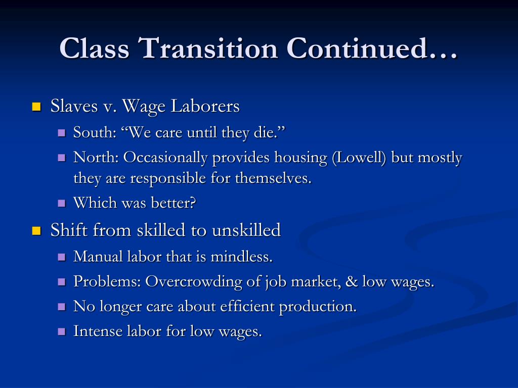 Class Transition Continued… • Slaves v. Wage Laborers • South: “We care until they die.” • North: Occasionally provides housing (Lowell) but mostly they are responsible for themselves. • Which was better? • Shift from skilled to unskilled • Manual labor that is mindless. • Problems: Overcrowding of job market, & low wages. • No longer care about efficient production. • Intense labor for low wages.