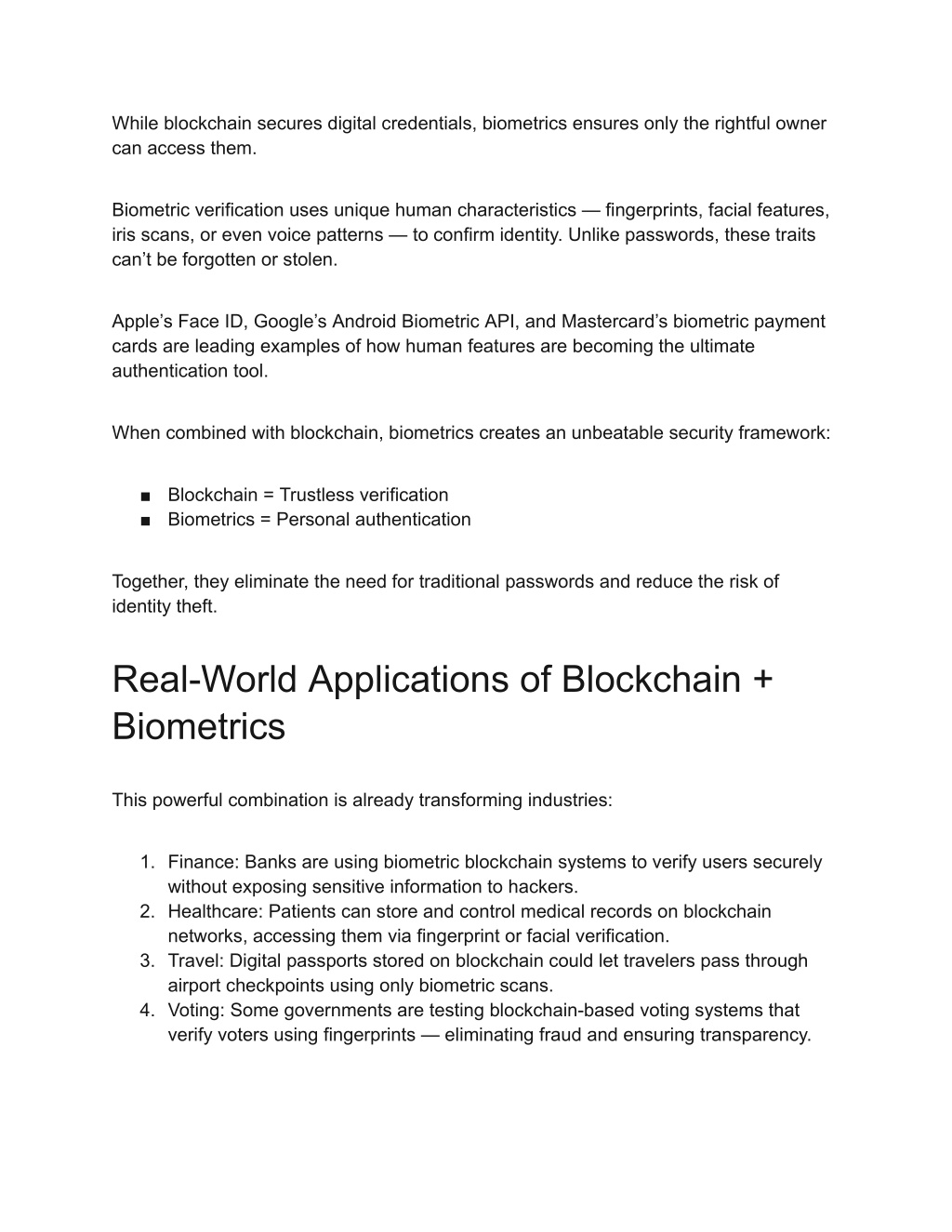 While blockchain secures digital credentials, biometrics ensures only the rightful owner can access them. Biometric verification uses unique human characteristics — fingerprints, facial features, iris scans, or even voice patterns — to confirm identity. Unlike passwords, these traits can’t be forgotten or stolen. Apple’s Face ID, Google’s Android Biometric API, and Mastercard’s biometric payment cards are leading examples of how human features are becoming the ultimate authentication tool. When combined with blockchain, biometrics creates an unbeatable security framework: ■ Blockchain = Trustless verification ■ Biometrics = Personal authentication Together, they eliminate the need for traditional passwords and reduce the risk of identity theft. Real-World Applications of Blockchain + Biometrics This powerful combination is already transforming industries: 1. Finance: Banks are using biometric blockchain systems to verify users securely without exposing sensitive information to hackers. 2. Healthcare: Patients can store and control medical records on blockchain networks, accessing them via fingerprint or facial verification. 3. Travel: Digital passports stored on blockchain could let travelers pass through airport checkpoints using only biometric scans. 4. Voting: Some governments are testing blockchain-based voting systems that verify voters using fingerprints — eliminating fraud and ensuring transparency.