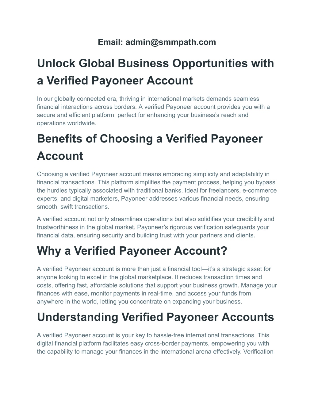 Email: admin@smmpath.com Unlock Global Business Opportunities with a Verified Payoneer Account In our globally connected era, thriving in international markets demands seamless financial interactions across borders. A verified Payoneer account provides you with a secure and efficient platform, perfect for enhancing your business’s reach and operations worldwide. Benefits of Choosing a Verified Payoneer Account Choosing a verified Payoneer account means embracing simplicity and adaptability in financial transactions. This platform simplifies the payment process, helping you bypass the hurdles typically associated with traditional banks. Ideal for freelancers, e-commerce experts, and digital marketers, Payoneer addresses various financial needs, ensuring smooth, swift transactions. A verified account not only streamlines operations but also solidifies your credibility and trustworthiness in the global market. Payoneer’s rigorous verification safeguards your financial data, ensuring security and building trust with your partners and clients. Why a Verified Payoneer Account? A verified Payoneer account is more than just a financial tool—it’s a strategic asset for anyone looking to excel in the global marketplace. It reduces transaction times and costs, offering fast, affordable solutions that support your business growth. Manage your finances with ease, monitor payments in real-time, and access your funds from anywhere in the world, letting you concentrate on expanding your business. Understanding Verified Payoneer Accounts A verified Payoneer account is your key to hassle-free international transactions. This digital financial platform facilitates easy cross-border payments, empowering you with the capability to manage your finances in the international arena effectively. Verification