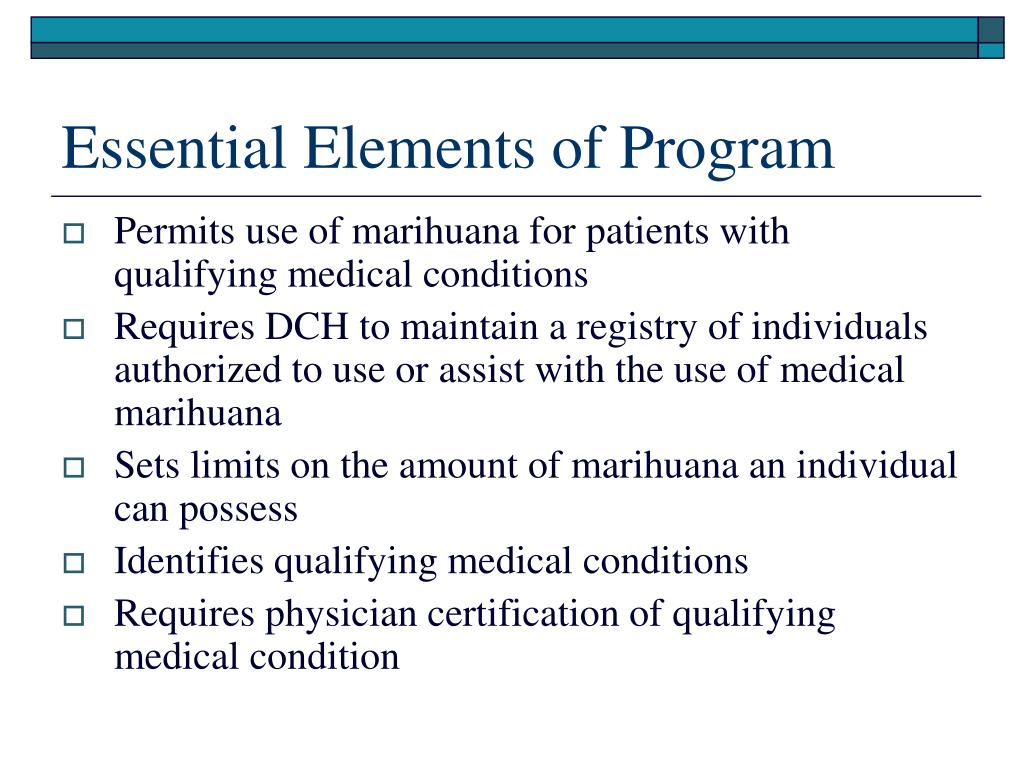 Essential Elements of Program • Permits use of marihuana for patients with qualifying medical conditions • Requires DCH to maintain a registry of individuals authorized to use or assist with the use of medical marihuana • Sets limits on the amount of marihuana an individual can possess • Identifies qualifying medical conditions • Requires physician certification of qualifying medical condition
