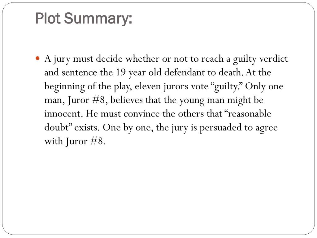 Plot Summary: • A jury must decide whether or not to reach a guilty verdict and sentence the 19 year old defendant to death. At the beginning of the play, eleven jurors vote “guilty.” Only one man, Juror #8, believes that the young man might be innocent. He must convince the others that “reasonable doubt” exists. One by one, the jury is persuaded to agree with Juror #8.