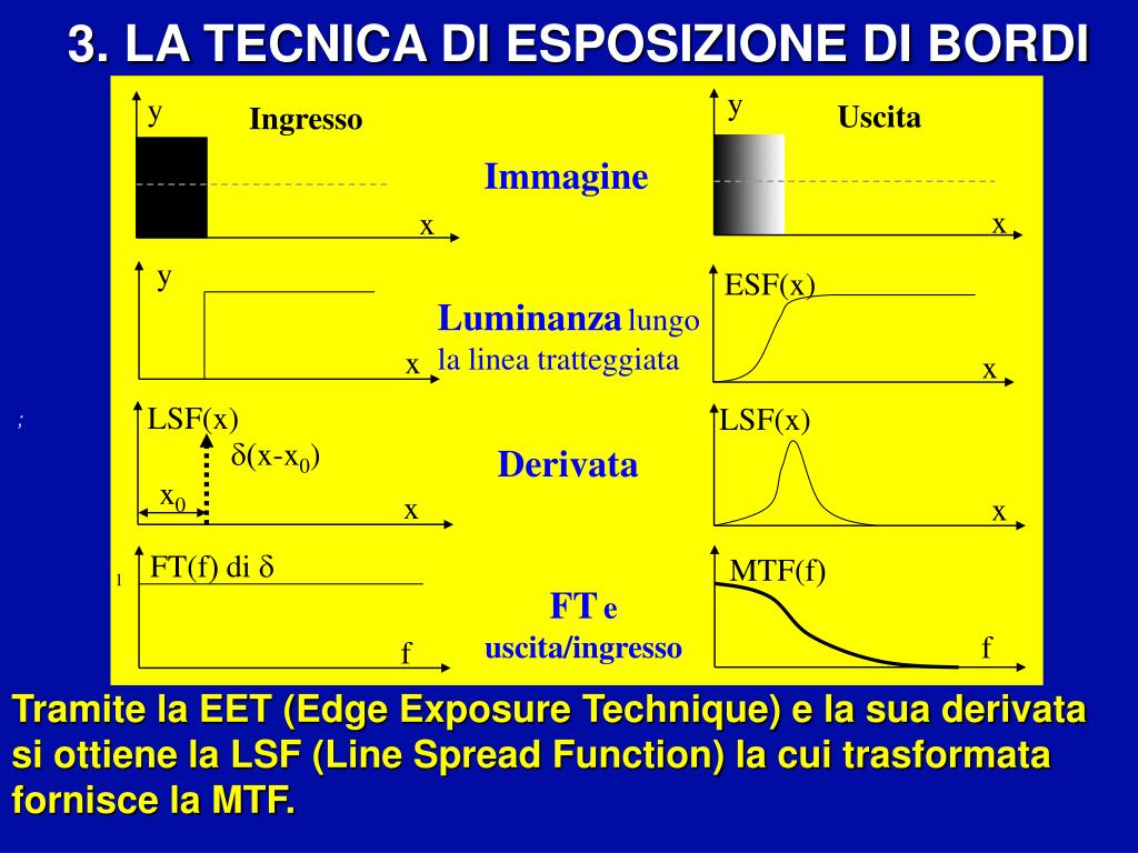 y y Uscita Ingresso Immagine x x y ESF(x) Luminanzalungo la linea tratteggiata x x LSF(x) LSF(x) ; d(x-x0) Derivata x0 x x FT(f) di d MTF(f) 1 FTe uscita/ingresso f f 3. LA TECNICA DI ESPOSIZIONE DI BORDI Tramite la EET (Edge Exposure Technique) e la sua derivata si ottiene la LSF (Line Spread Function) la cui trasformata fornisce la MTF.
