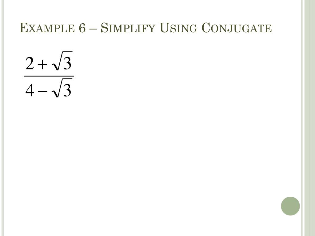 Conjugates • Binomials that differ by one sign (+ vs -) are called conjugates.