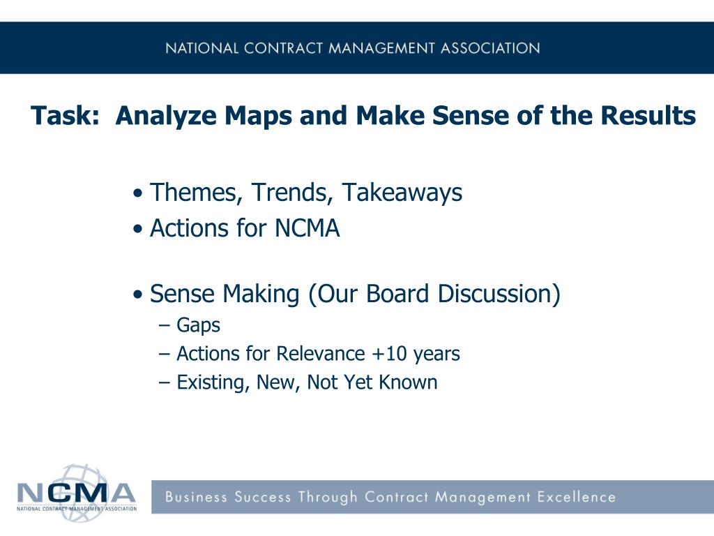 Task: Analyze Maps and Make Sense of the Results • Themes, Trends, Takeaways • Actions for NCMA • Sense Making (Our Board Discussion) • Gaps • Actions for Relevance +10 years • Existing, New, Not Yet Known