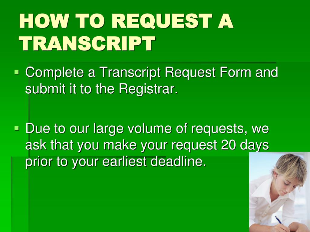 HOW TO REQUEST A TRANSCRIPT • Complete a Transcript Request Form and submit it to the Registrar. • Due to our large volume of requests, we ask that you make your request 20 days prior to your earliest deadline.