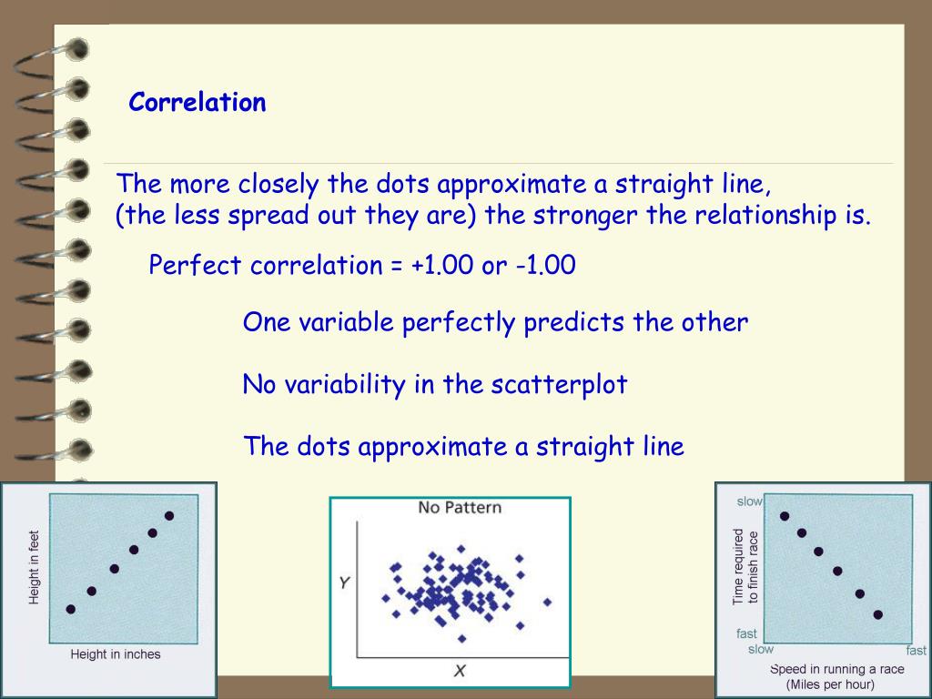 Correlation The more closely the dots approximate a straight line,(the less spread out they are) the stronger the relationship is. Perfect correlation = +1.00 or -1.00 One variable perfectly predicts the other No variability in the scatterplot The dots approximate a straight line