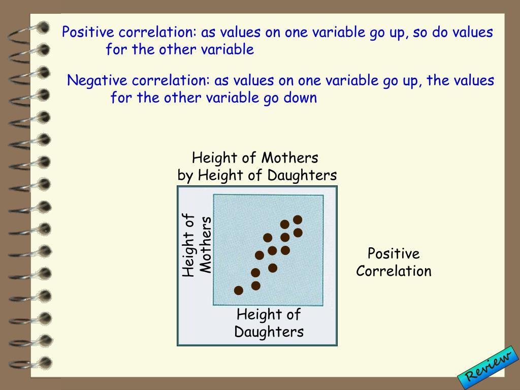 Positive correlation: as values on one variable go up, so do values for the other variable Negative correlation: as values on one variable go up, the values for the other variable go down Height of Mothers by Height of Daughters Height ofMothers Positive Correlation Height of Daughters Review