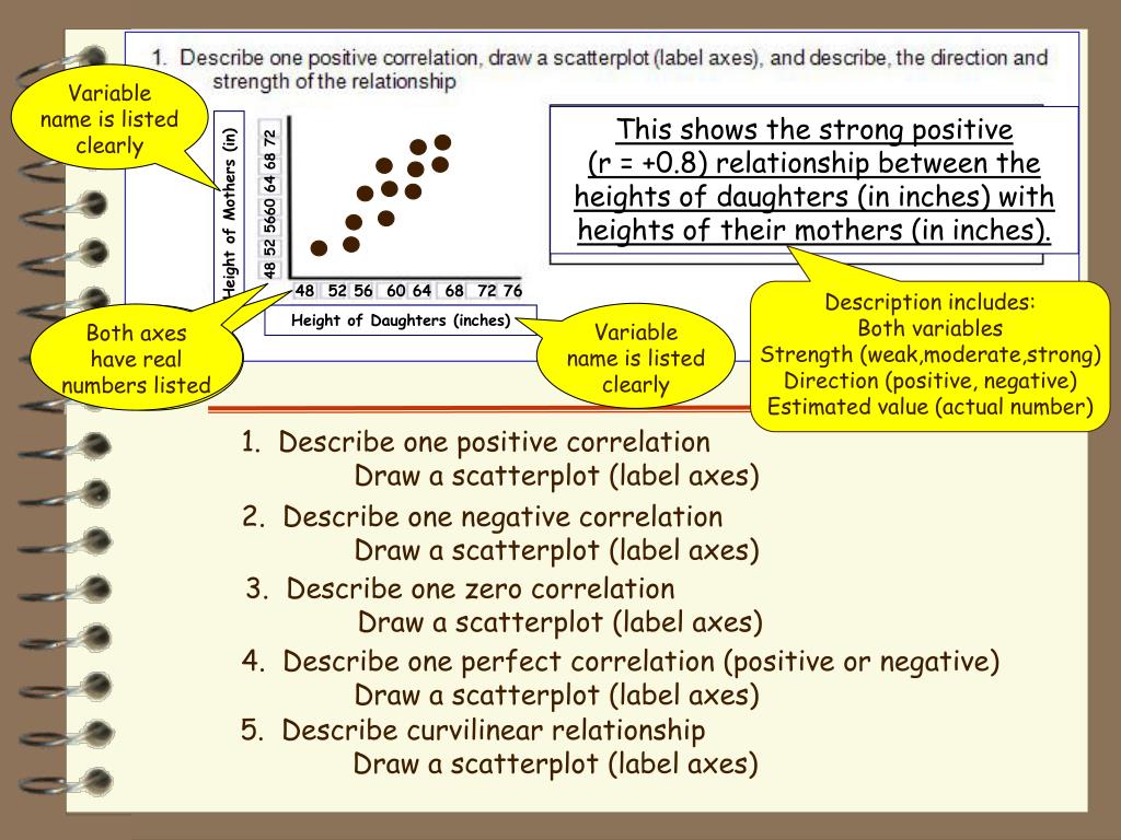 Variable name is listed clearly Description includes: Both variables Strength (weak,moderate,strong) Direction (positive, negative) Estimated value (actual number) Variable name is listed clearly Both axes have real numbers listed Both axes and values are labeled This shows the strong positive (r = +0.8) relationship between the heights of daughters (in inches) with heights of their mothers (in inches). 48 52 5660 64 68 72 Height of Mothers (in) 48 52 56 60 64 68 72 76 Height of Daughters (inches)