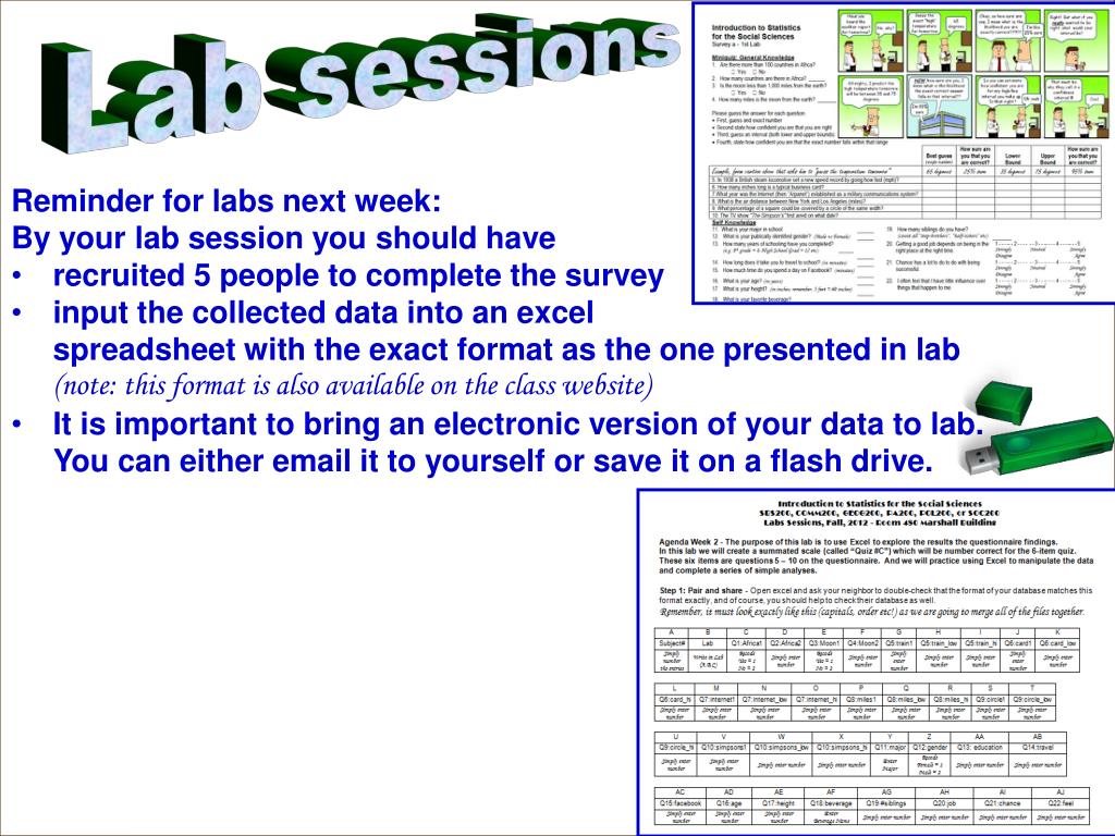 Lab sessions Labs This week • Remember: • Bring electronic copy of your data (flash drive or email it to yourself) • Your data should have correct formatting • See Lab Materials link on class website to double-check formatting of excel is exactly consistent