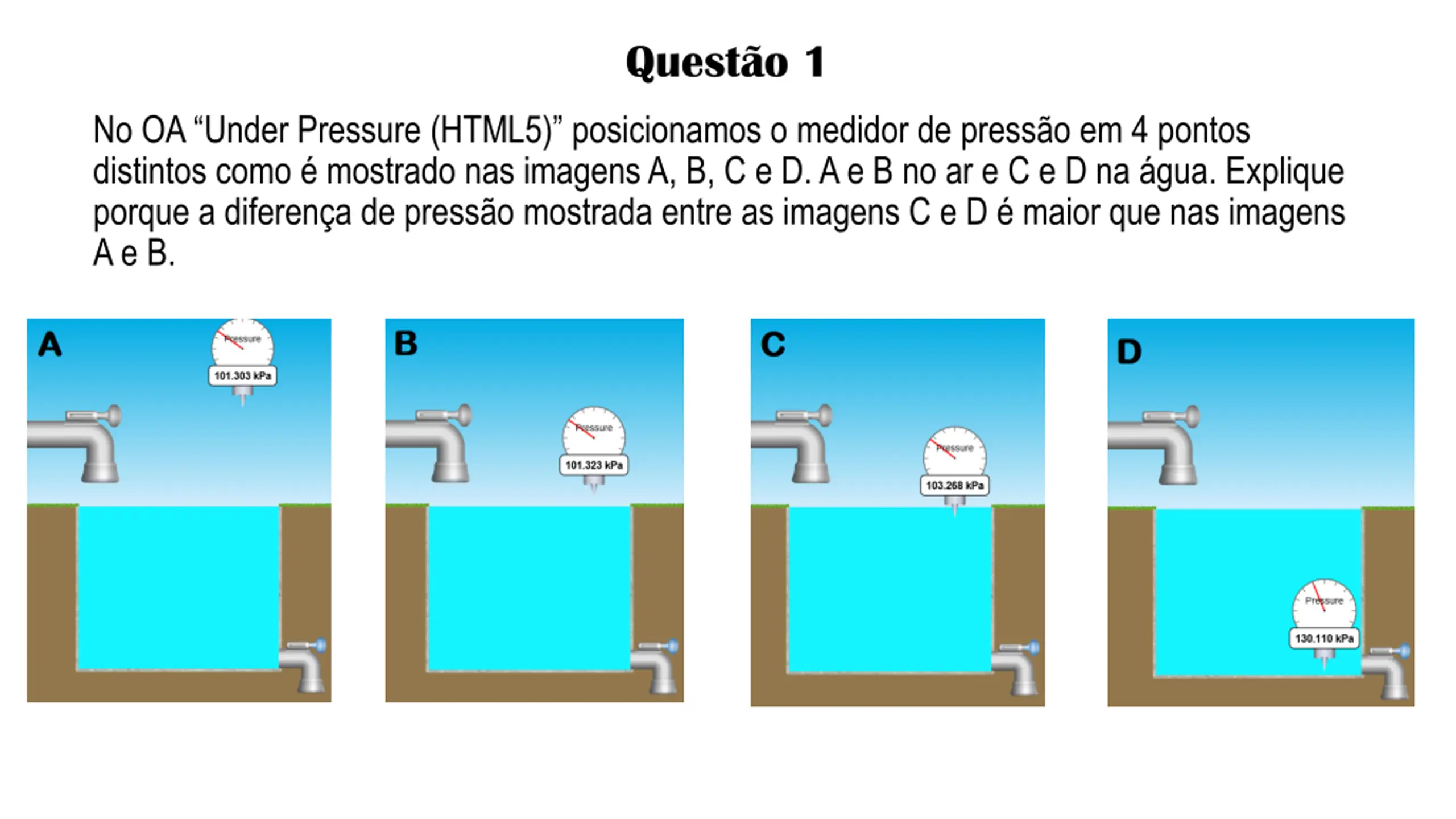 5. Questão 1 No OA “Under Pressure (HTML5)” posicionamos o medidor de pressão em 4 pontos distintos como é mostrado nas imagens A, B, C e D. A e B no ar e C e D na água. Explique porque a diferença de pressão mostrada entre as imagens C e D é maior que nas imagens A e B.