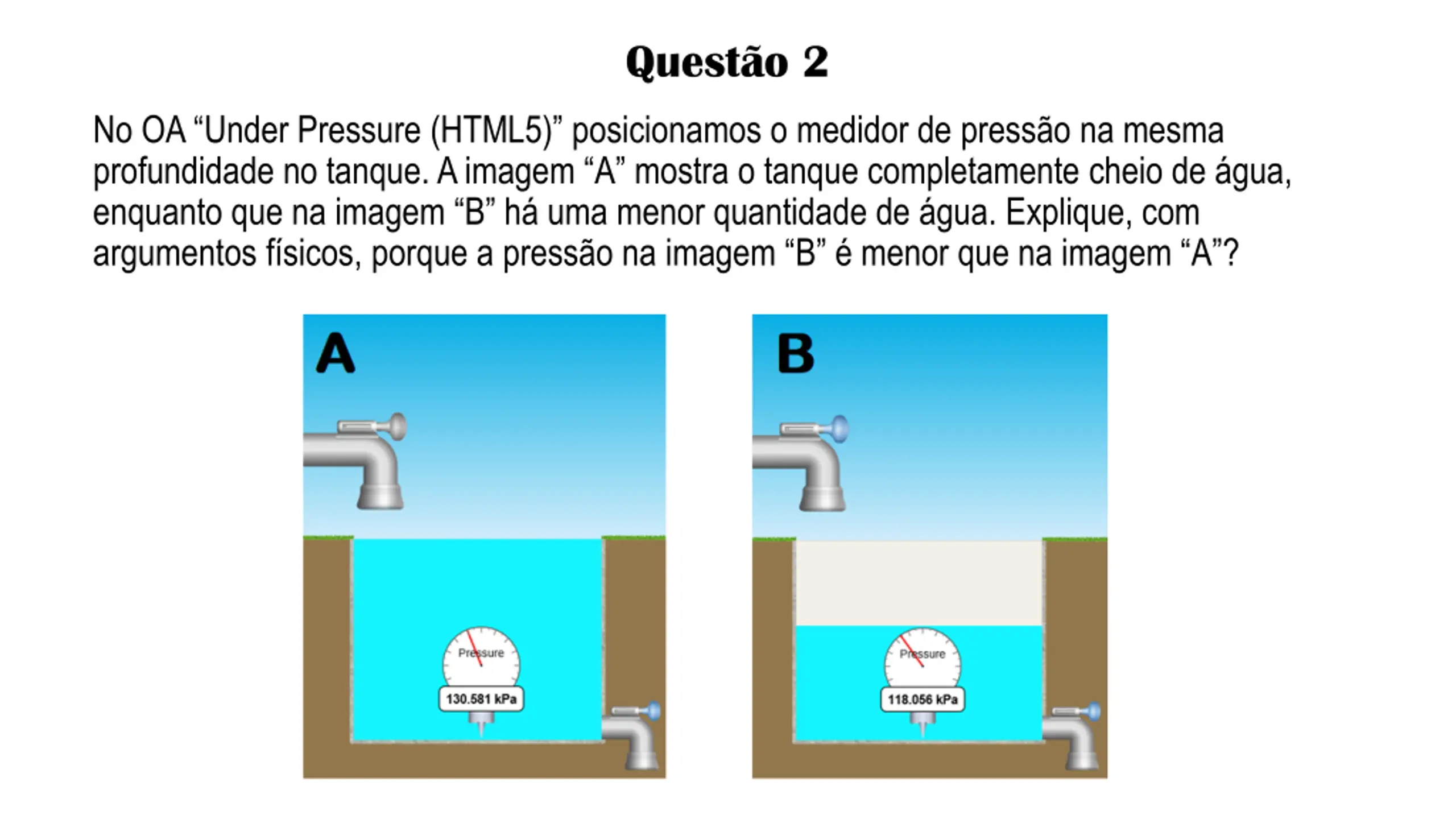 6. Questão 2 No OA “Under Pressure (HTML5)” posicionamos o medidor de pressão na mesma profundidade no tanque. A imagem “A” mostra o tanque completamente cheio de água, enquanto que na imagem “B” há uma menor quantidade de água. Explique, com argumentos físicos, porque a pressão na imagem “B” é menor que na imagem “A”?