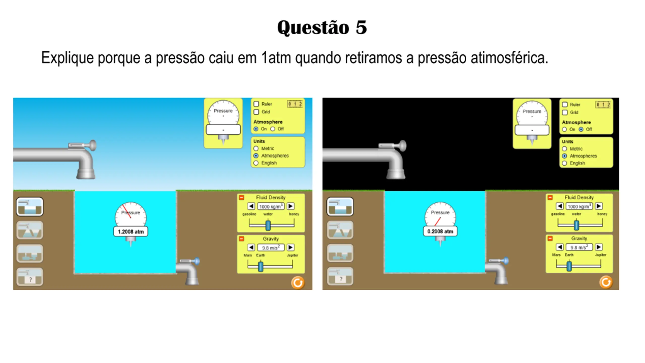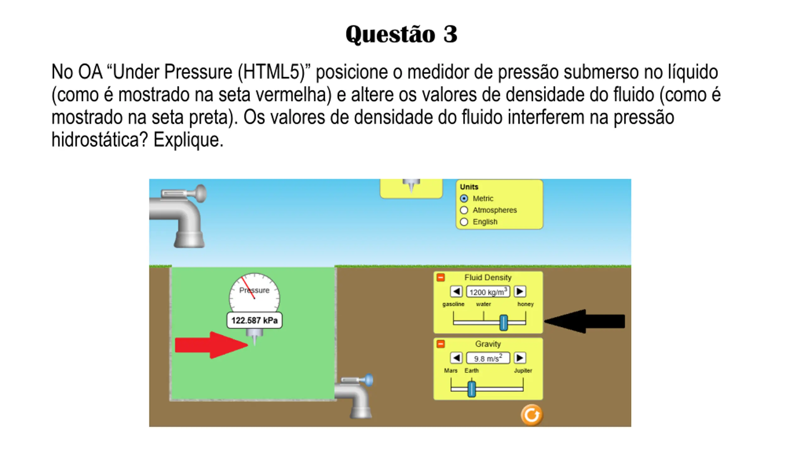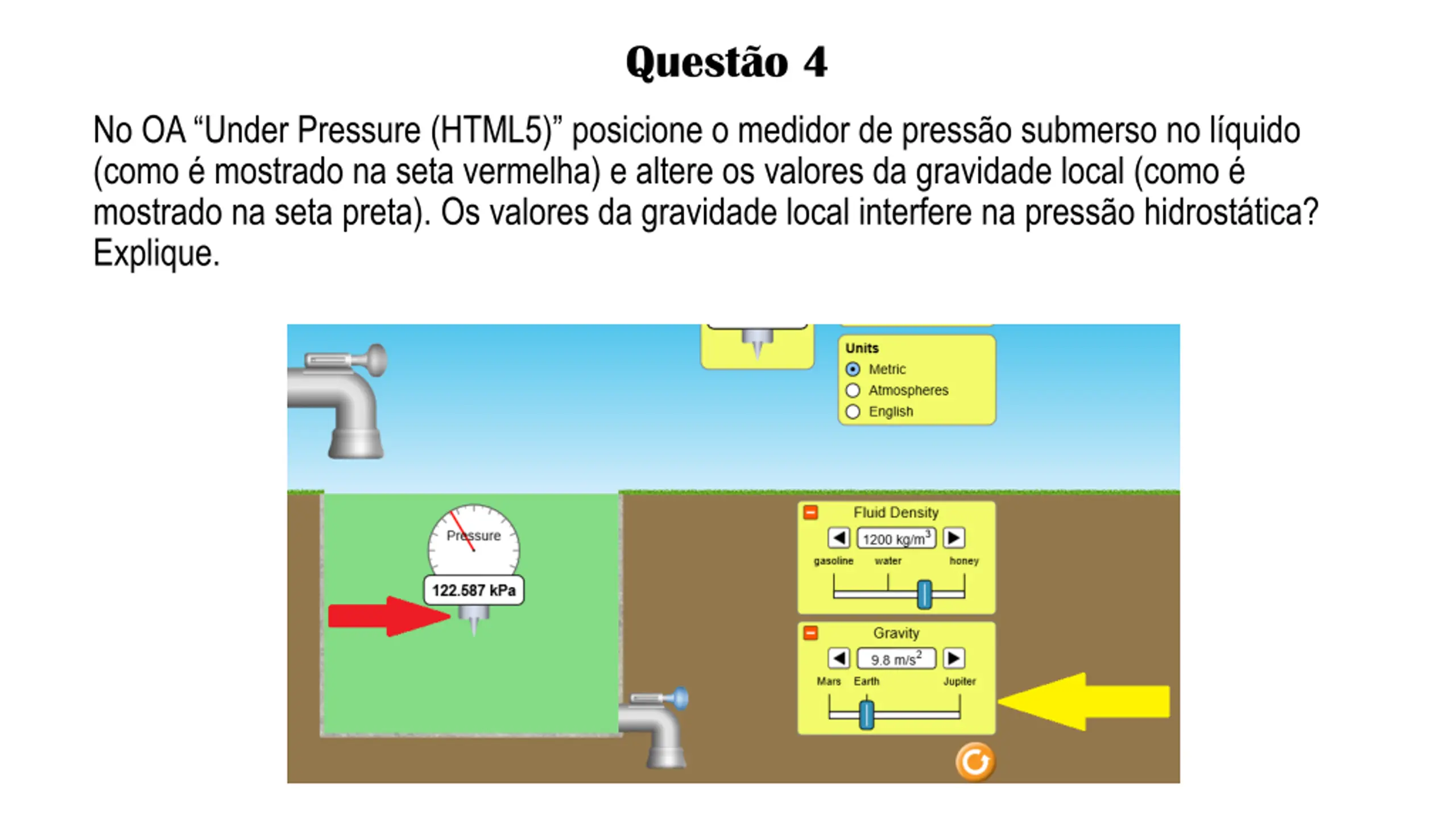 8. Questão 4 No OA “Under Pressure (HTML5)” posicione o medidor de pressão submerso no líquido (como é mostrado na seta vermelha) e altere os valores da gravidade local (como é mostrado na seta preta). Os valores da gravidade local interfere na pressão hidrostática? Explique.