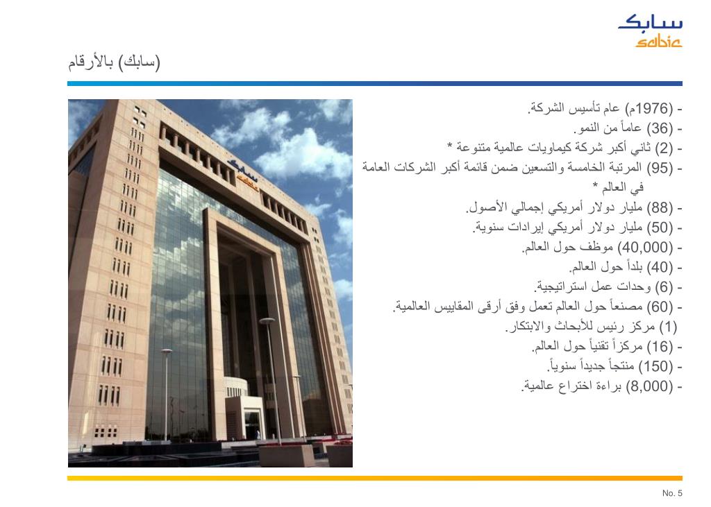 (سابك) بالأرقام - (1976م) عام تأسيس الشركة. - (36) عاماً من النمو. - (2) ثاني أكبر شركة كيماويات عالمية متنوعة * - (95) المرتبة الخامسة والتسعين ضمن قائمة أكبر الشركات العامة • في العالم * - (88) مليار دولار أمريكي إجمالي الأصول. - (50) مليار دولار أمريكي إيرادات سنوية. - (40,000) موظف حول العالم. - (40) بلداً حول العالم. - (6) وحدات عمل استراتيجية. - (60) مصنعاً حول العالم تعمل وفق أرقى المقاييس العالمية. • (1) مركز رئيس للأبحاث والابتكار. - (16) مركزاً تقنياً حول العالم. - (150) منتجاً جديداً سنوياً. - (8,000) براءة اختراع عالمية.