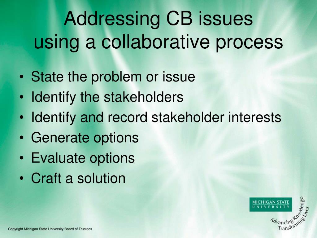 Addressing CB issuesusing a collaborative process • State the problem or issue • Identify the stakeholders • Identify and record stakeholder interests • Generate options • Evaluate options • Craft a solution