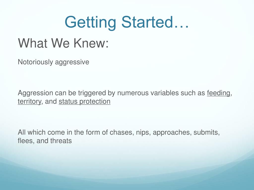 Getting Started… What We Knew: Notoriously aggressive Aggression can be triggered by numerous variables such as feeding, territory, and status protection All which come in the form of chases, nips, approaches, submits, flees, and threats