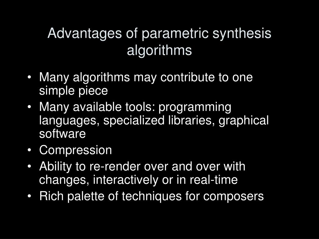 Advantages of parametric synthesis algorithms • Many algorithms may contribute to one simple piece • Many available tools: programming languages, specialized libraries, graphical software • Compression • Ability to re-render over and over with changes, interactively or in real-time • Rich palette of techniques for composers