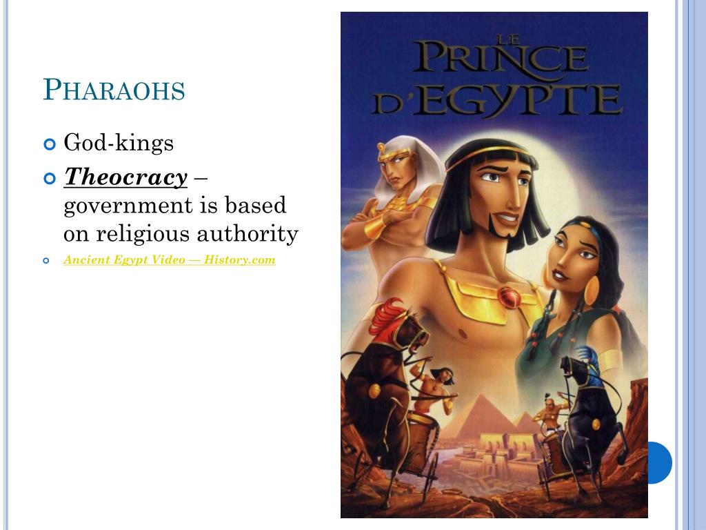 Pharaohs • God-kings • Theocracy – government is based on religious authority • Ancient Egypt Video — History.com