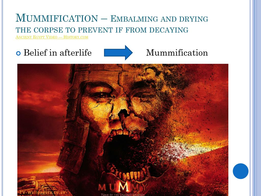 Mummification – Embalming and drying the corpse to prevent if from decaying Ancient Egypt Video — History.com • Belief in afterlife Mummification