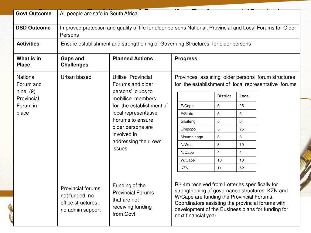 Conclusion • There are various programmes, policies and pieces of legislation that have been developed and implemented by government departments to deliver services to all age groups, including older persons. However, these services are not integrated, and do not always specifically target the needs of older persons. • There is a need to strengthen intersectoral collaboration through an integrated forum of key departments and stakeholders. • In terms of the Older Persons Act (Act 13 of 2006), each government department has a specific responsibility and role to play on the issues affecting older persons. This has not been forthcoming from some of the departments in the coordination and integration of service delivery. • The National Development Plan, in its reference to provision of social protection services to the most vulnerable members of society which include the older persons, also stresses that coordination is essential in the delivery of such services