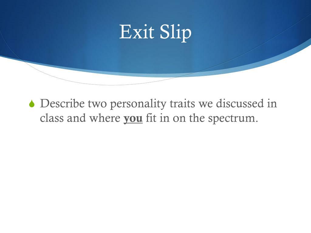 Exit Slip • Describe two personality traits we discussed in class and where you fit in on the spectrum.