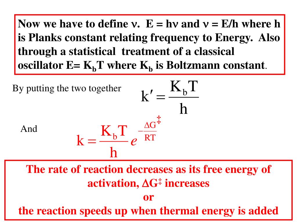 Now we have to define n. E = hn and n = E/h where h is Planks constant relating frequency to Energy. Also through a statistical treatment of a classical oscillator E= KbT where Kb is Boltzmann constant. By putting the two together ‡ And The rate of reaction decreases as its free energy of activation, DG‡ increases or the reaction speeds up when thermal energy is added