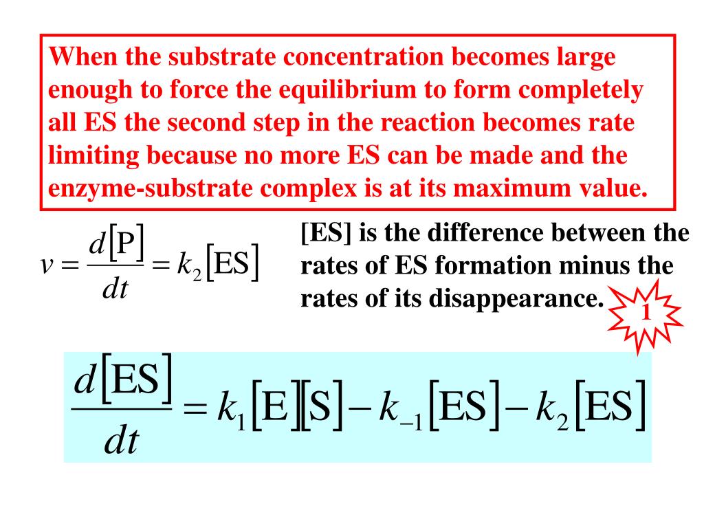 When the substrate concentration becomes large enough to force the equilibrium to form completely all ES the second step in the reaction becomes rate limiting because no more ES can be made and the enzyme-substrate complex is at its maximum value. [ES] is the difference between the rates of ES formation minus the rates of its disappearance. 1