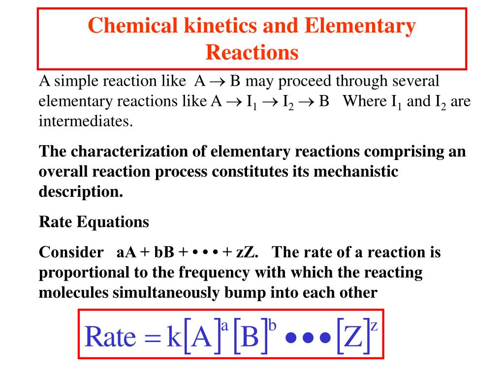 Chemical kinetics and Elementary Reactions A simple reaction like A B may proceed through several elementary reactions like A I1 I2 B Where I1 and I2 are intermediates. The characterization of elementary reactions comprising an overall reaction process constitutes its mechanistic description. Rate Equations Consider aA + bB + • • • + zZ. The rate of a reaction is proportional to the frequency with which the reacting molecules simultaneously bump into each other