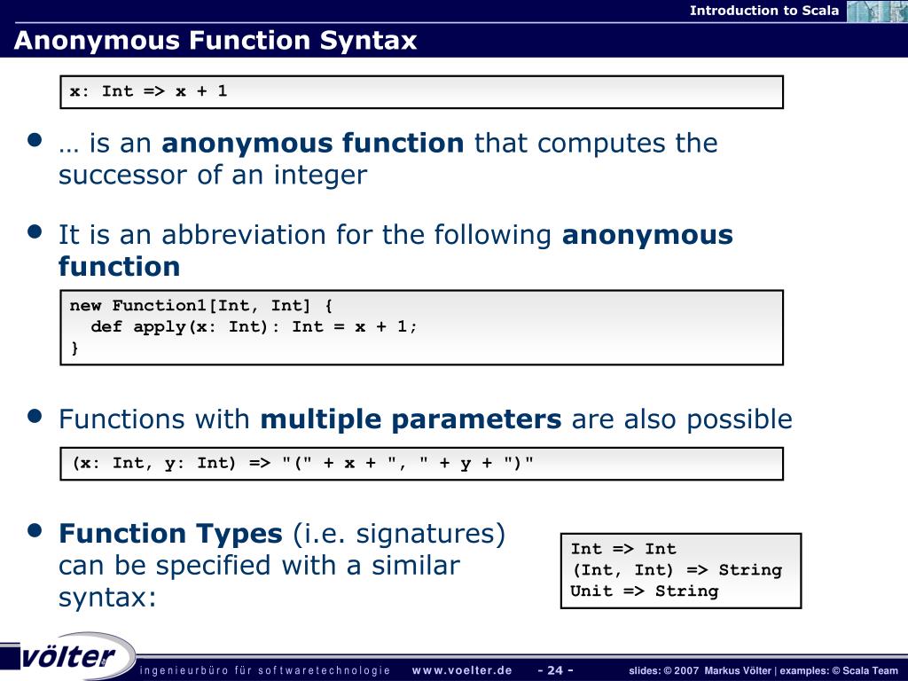 Anonymous Function Syntax x: Int => x + 1 • … is an anonymous function that computes the successor of an integer • It is an abbreviation for the following anonymous function • Functions with multiple parameters are also possible • Function Types (i.e. signatures) can be specified with a similar syntax: new Function1[Int, Int] { def apply(x: Int): Int = x + 1;} (x: Int, y: Int) => "(" + x + ", " + y + ")" Int => Int(Int, Int) => StringUnit => String