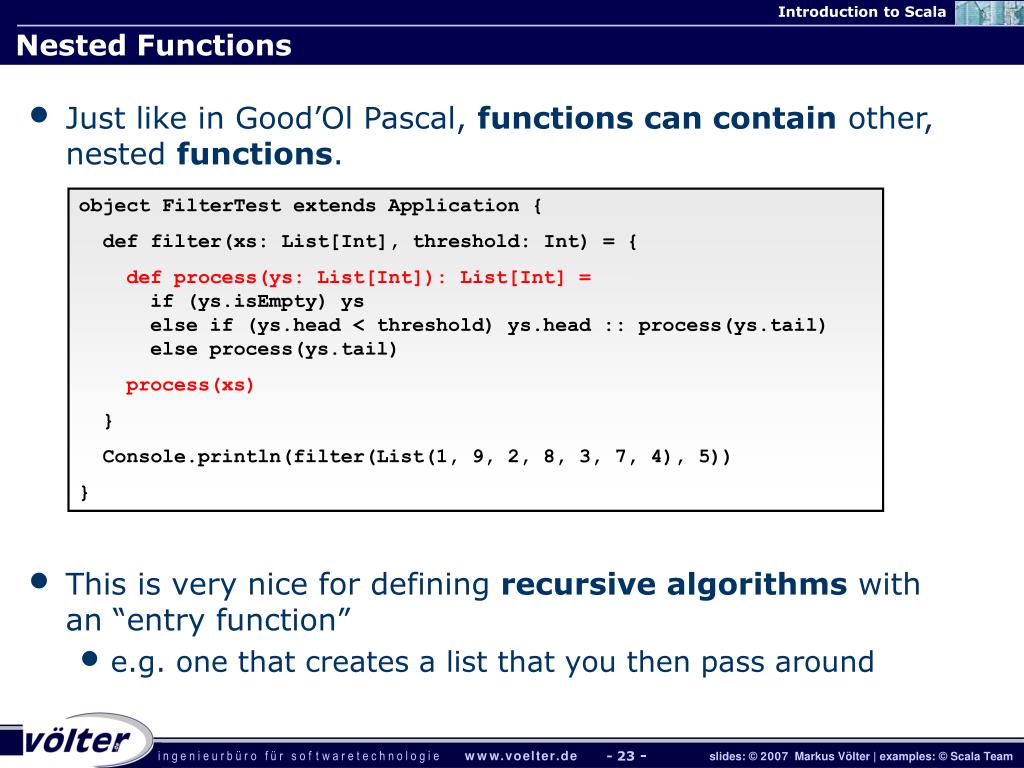 Nested Functions • Just like in Good’Ol Pascal, functions can contain other, nested functions. • This is very nice for defining recursive algorithms with an “entry function” • e.g. one that creates a list that you then pass around object FilterTest extends Application { def filter(xs: List[Int], threshold: Int) = { def process(ys: List[Int]): List[Int] =if (ys.isEmpty) ys else if (ys.head < threshold) ys.head :: process(ys.tail) else process(ys.tail) process(xs) } Console.println(filter(List(1, 9, 2, 8, 3, 7, 4), 5)) }