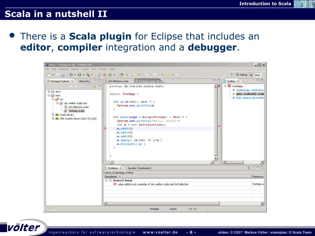 Scala in a nutshell II • There is a Scala plugin for Eclipse that includes an editor, compiler integration and a debugger.