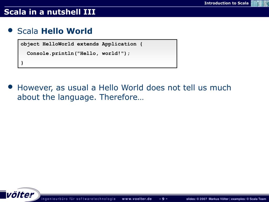 Scala in a nutshell III • Scala Hello World • However, as usual a Hello World does not tell us much about the language. Therefore… object HelloWorld extends Application { Console.println("Hello, world!"); }