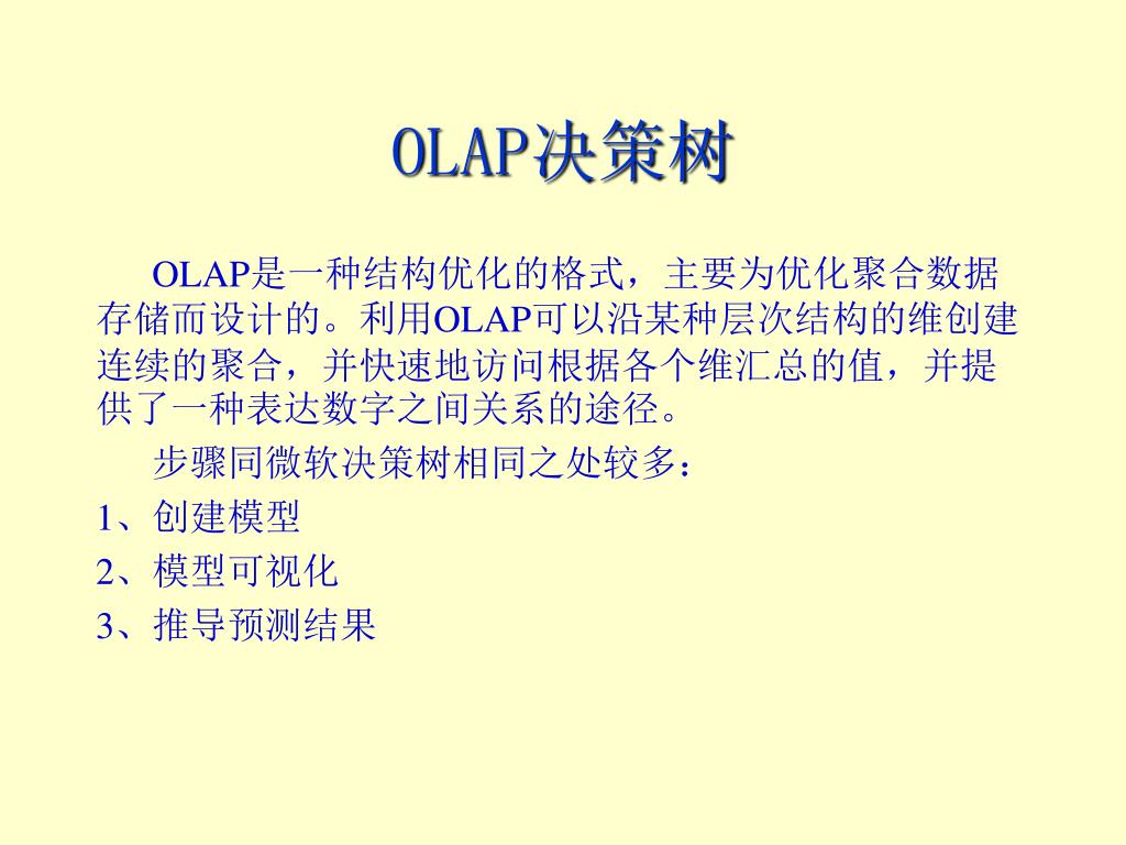 OLAP决策树 OLAP是一种结构优化的格式,主要为优化聚合数据存储而设计的。利用OLAP可以沿某种层次结构的维创建连续的聚合,并快速地访问根据各个维汇总的值,并提供了一种表达数字之间关系的途径。 步骤同微软决策树相同之处较多: 1、创建模型 2、模型可视化 3、推导预测结果