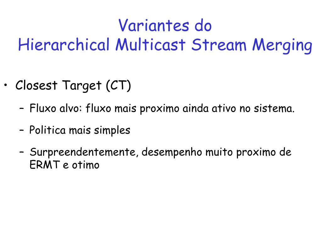 Variantes do Hierarchical Multicast Stream Merging • Closest Target (CT) • Fluxo alvo: fluxo mais proximo ainda ativo no sistema. • Politica mais simples • Surpreendentemente, desempenho muito proximo de ERMT e otimo
