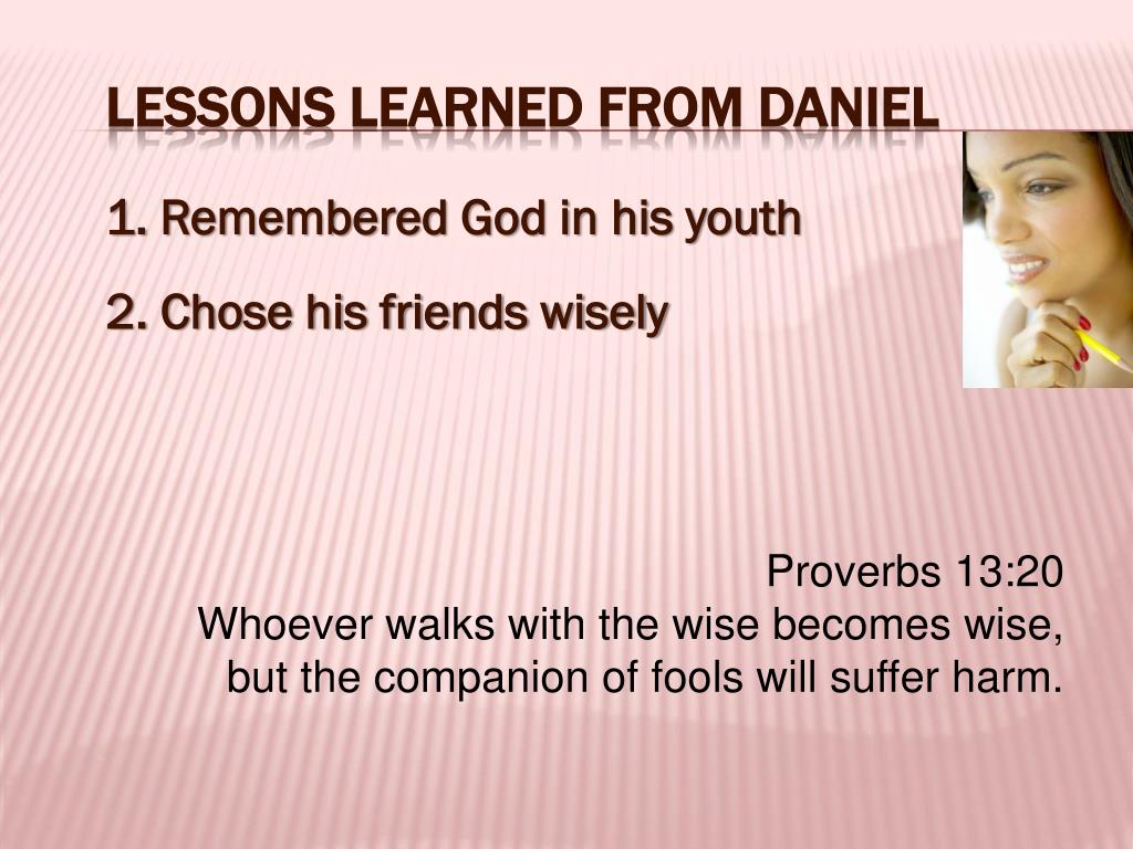 1. Remembered God in his youth Lessons learned from daniel 2. Chose his friends wisely Proverbs 13:20 Whoever walks with the wise becomes wise,but the companion of fools will suffer harm.