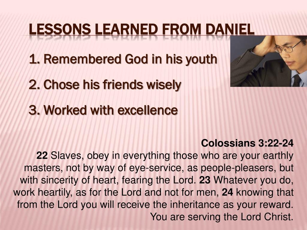 1. Remembered God in his youth Lessons learned from daniel 2. Chose his friends wisely 3. Worked with excellence Colossians 3:22-24 22 Slaves, obey in everything those who are your earthly masters, not by way of eye-service, as people-pleasers, but with sincerity of heart, fearing the Lord. 23 Whatever you do, work heartily, as for the Lord and not for men, 24 knowing that from the Lord you will receive the inheritance as your reward. You are serving the Lord Christ.
