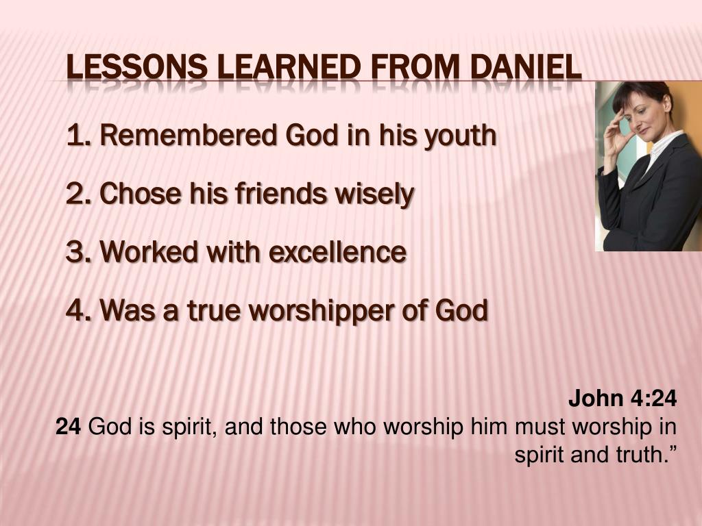 1. Remembered God in his youth Lessons learned from daniel 2. Chose his friends wisely 3. Worked with excellence 4. Was a true worshipper of God John 4:24 24 God is spirit, and those who worship him must worship in spirit and truth.”
