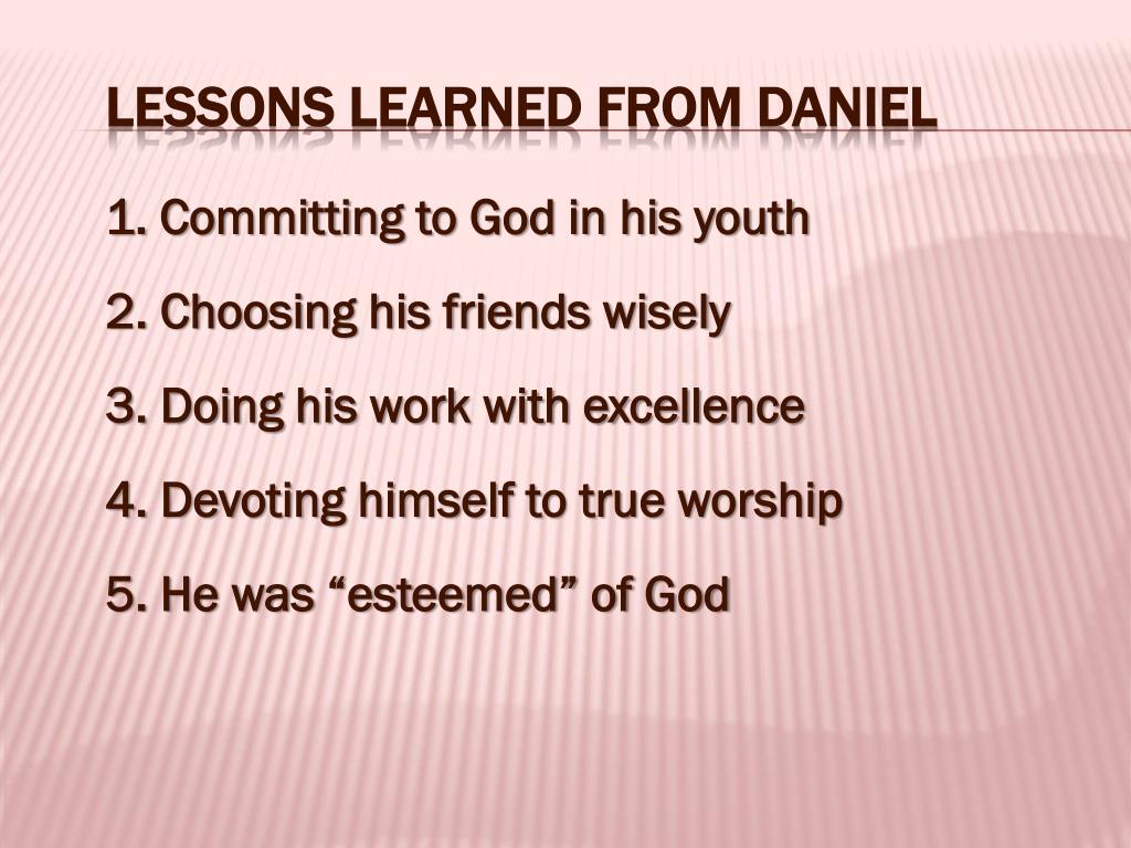 1. Committing to God in his youth Lessons learned from daniel 2. Choosing his friends wisely 3. Doing his work with excellence 4. Devoting himself to true worship 5. He was “esteemed” of God