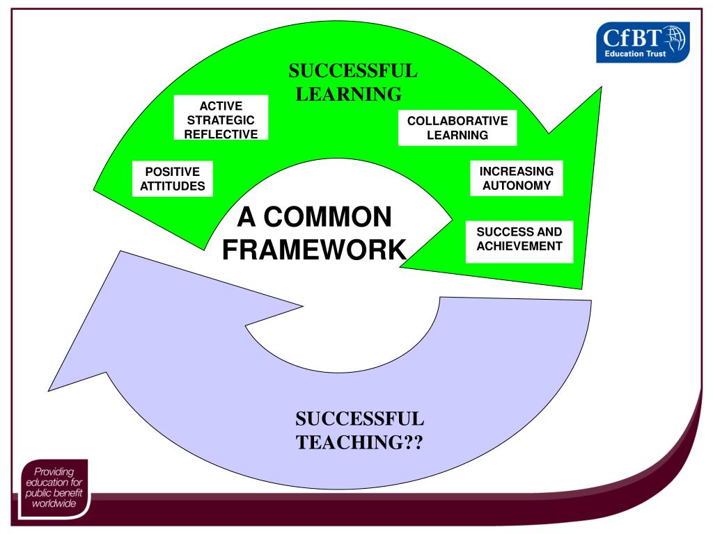 SUCCESSFUL LEARNING ACTIVE LEARNING COLLABORATIVE LEARNING INCREASING AUTONOMY POSITIVE ATTITUDES A COMMON FRAMEWORK SUCCESS AND ACHIEVEMENT ASSESSMENT FOR LEARNING PLANNING & LESSON STRUCTURE INTERACTIVE TEACHING CLASSROOM MANAGEMENT TEACHING ACTIVE LEARNING STRATEGIES SUCCESSFUL TEACHING