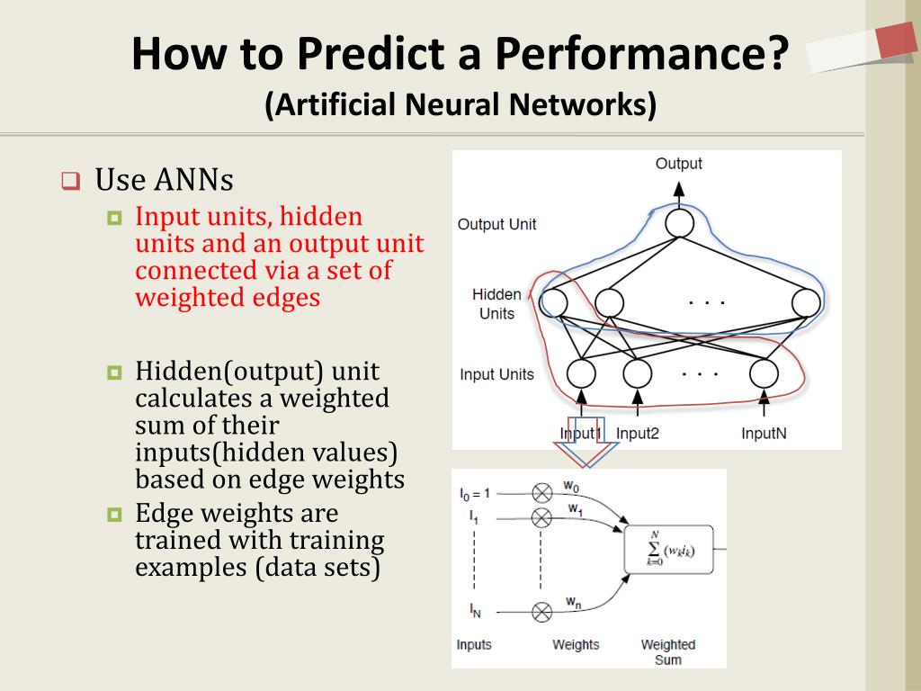 How to Predict a Performance?(Artificial Neural Networks) • Use ANNs • Input units, hidden units and an output unit connected via a set of weighted edges • Hidden(output) unit calculates a weighted sum of their inputs(hidden values) based on edge weights • Edge weights are trained with training examples (data sets)