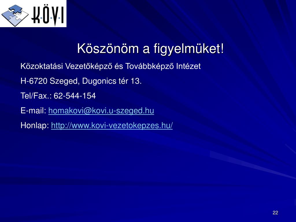 Köszönöm a figyelmüket! Közoktatási Vezetőképző és Továbbképző Intézet H-6720 Szeged, Dugonics tér 13. Tel/Fax.: 62-544-154 E-mail: homakovi@kovi.u-szeged.hu Honlap: http://www.kovi-vezetokepzes.hu/