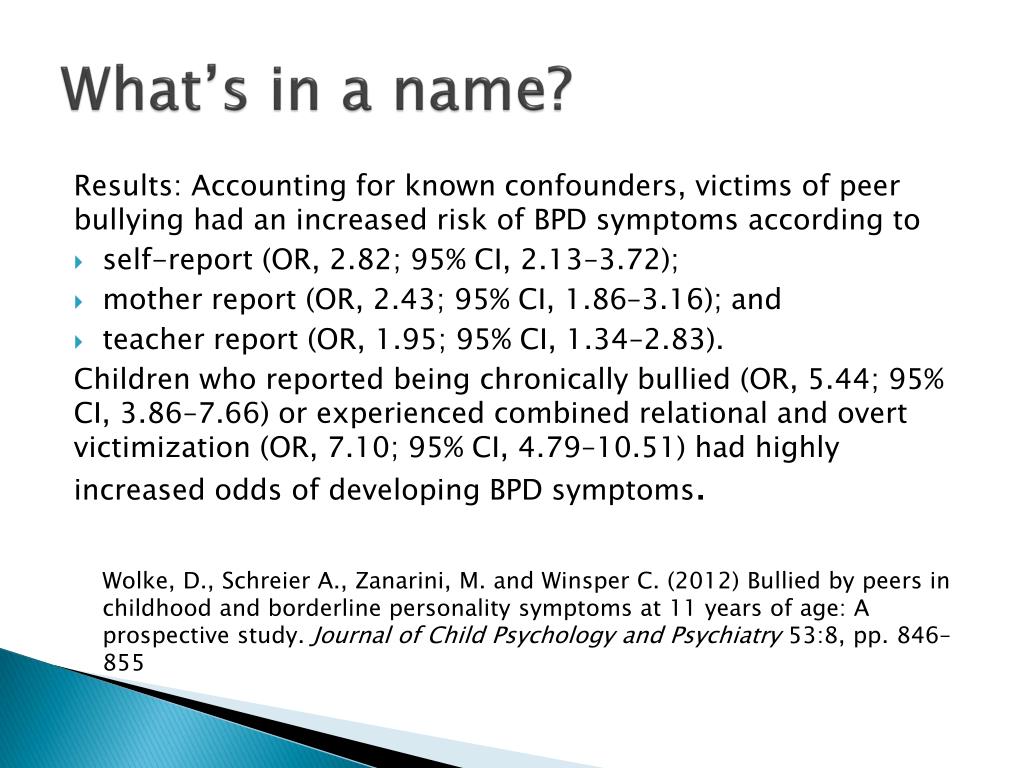 What’s in a name? Results: Accounting for known confounders, victims of peer bullying had an increased risk of BPD symptoms according to • self-report (OR, 2.82; 95% CI, 2.13–3.72); • mother report (OR, 2.43; 95% CI, 1.86–3.16); and • teacher report (OR, 1.95; 95% CI, 1.34–2.83). Children who reported being chronically bullied (OR, 5.44; 95% CI, 3.86–7.66) or experienced combined relational and overt victimization (OR, 7.10; 95% CI, 4.79–10.51) had highly increased odds of developing BPD symptoms. Wolke, D., SchreierA., Zanarini, M. and Winsper C. (2012) Bullied by peers in childhood and borderline personality symptoms at 11 years of age: A prospective study.Journal of Child Psychology and Psychiatry 53:8, pp. 846–855