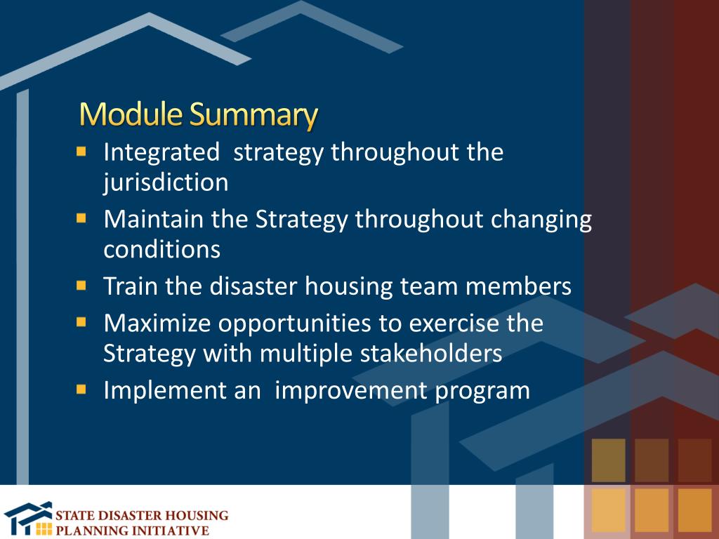 Module Summary • Integrated strategy throughout the jurisdiction • Maintain the Strategy throughout changing conditions • Train the disaster housing team members • Maximize opportunities to exercise the Strategy with multiple stakeholders • Implement an improvement program