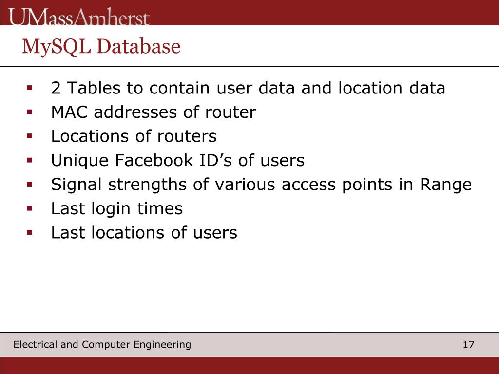 Design Challenges • Forced to use API’s for Flash and PHP due to Facebook security restrictions for applications • 1 MAC address for large area on the UMASS wireless network - from campus center to engineering lab. • Portability of Windows application