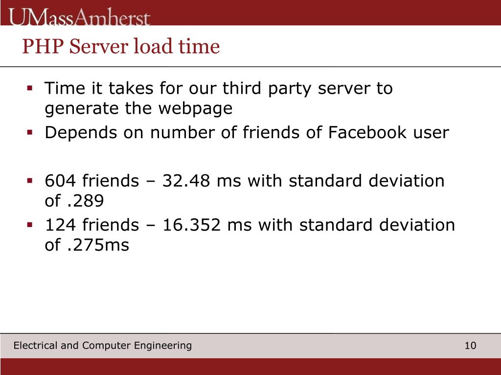 PHP Server load time • Time it takes for our third party server to generate the webpage • Depends on number of friends of Facebook user • 604 friends – 32.48 ms with standard deviation of .289 • 124 friends – 16.352 ms with standard deviation of .275ms