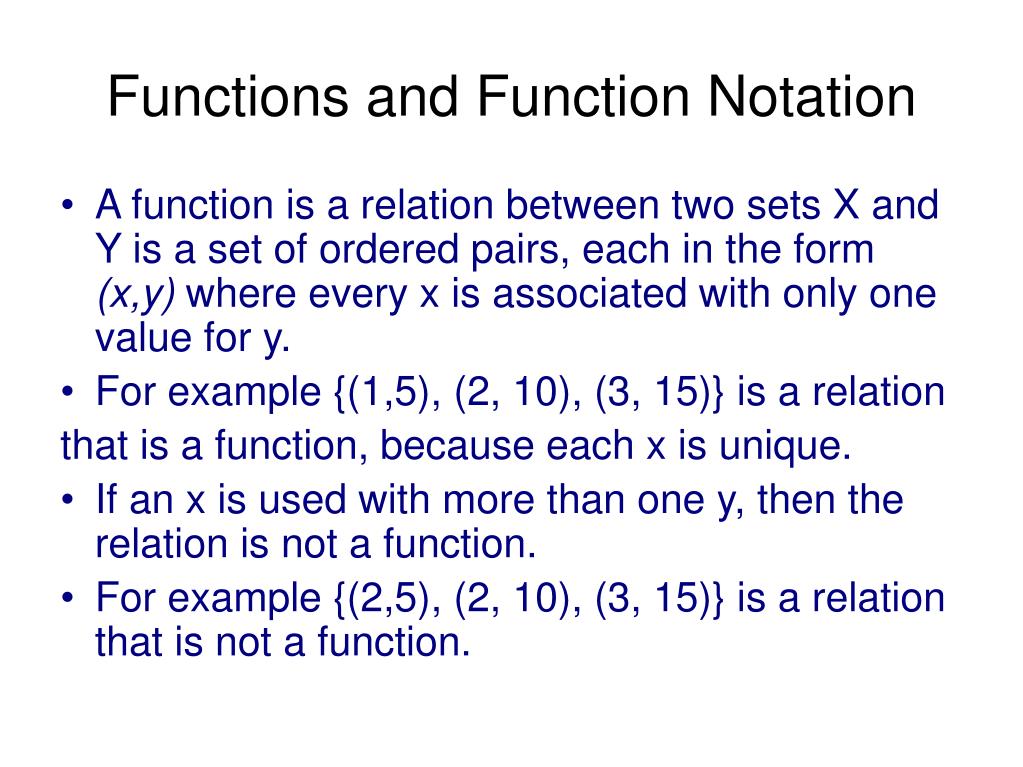 Functions and Function Notation • A function is a relation between two sets X and Y is a set of ordered pairs, each in the form (x,y) where every x is associated with only one value for y. • For example {(1,5), (2, 10), (3, 15)} is a relation that is a function, because each x is unique. • If an x is used with more than one y, then the relation is not a function. • For example {(2,5), (2, 10), (3, 15)} is a relation that is not a function.