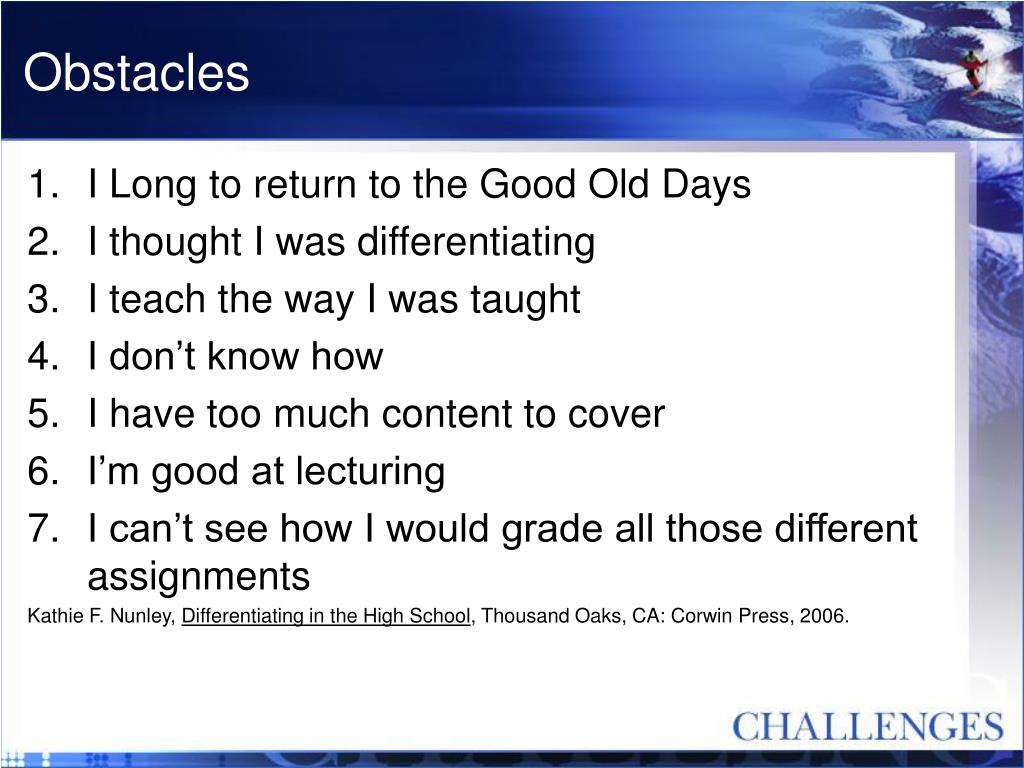 Obstacles • I Long to return to the Good Old Days • I thought I was differentiating • I teach the way I was taught • I don’t know how • I have too much content to cover • I’m good at lecturing • I can’t see how I would grade all those different assignments Kathie F. Nunley, Differentiating in the High School, Thousand Oaks, CA: Corwin Press, 2006.