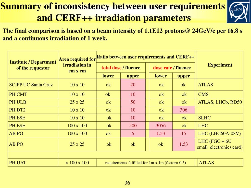 Summary of inconsistency between user requirements and CERF++ irradiation parameters The final comparison is based on a beam intensity of 1.1E12 protons@ 24GeV/c per 16.8 s and a continuous irradiation of 1 week.