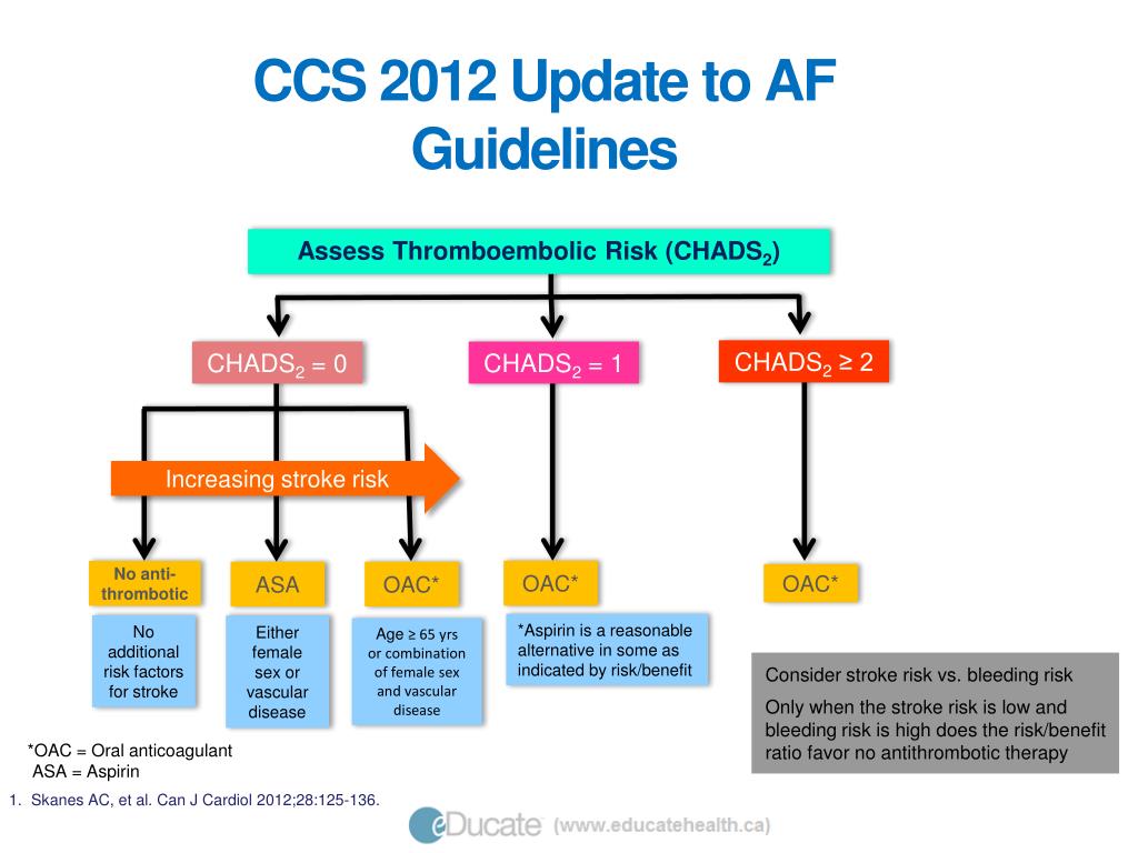 CCS 2012 Update to AF Guidelines Assess Thromboembolic Risk (CHADS2) CHADS2 ≥ 2 CHADS2 = 0 CHADS2 = 1 Increasing stroke risk OAC* No anti-thrombotic ASA OAC* OAC* *Aspirin is a reasonable alternative in some as indicated by risk/benefit No additional risk factors for stroke Either female sex or vascular disease Age ≥ 65 yrs or combination of female sex and vascular disease Consider stroke risk vs. bleeding risk Only when the stroke risk is low and bleeding risk is high does the risk/benefit ratio favor no antithrombotic therapy *OAC = Oral anticoagulant ASA = Aspirin Skanes AC, et al. Can J Cardiol 2012;28:125-136.