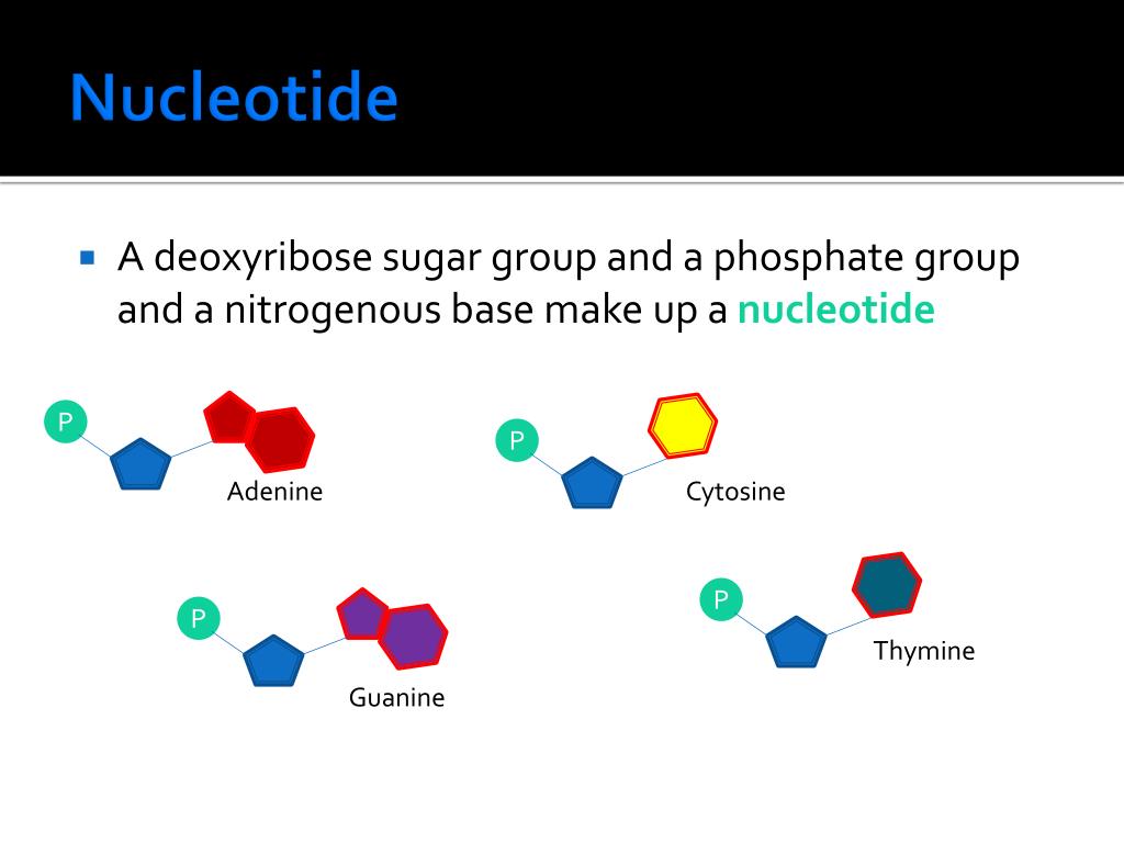 Nucleotide • A deoxyribose sugar group and a phosphate group and a nitrogenous base make up a nucleotide P P Adenine Cytosine P P Thymine Guanine