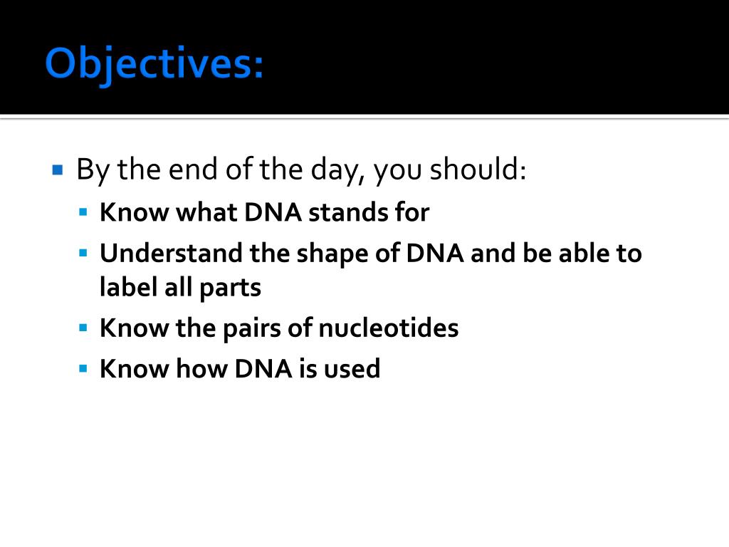 Objectives: • By the end of the day, you should: • Know what DNA stands for • Understand the shape of DNA and be able to label all parts • Know the pairs of nucleotides • Know how DNA is used
